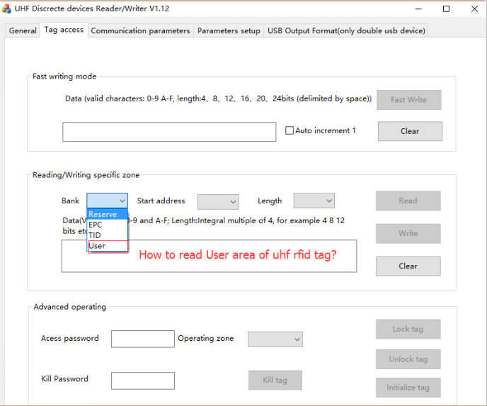 لقراءة بيانات منطقة المستخدم، يُنصح بالاطلاع على اتفاقية EPC، حيث تتضمن عمليات EPC الأساسية القراءة والكتابة والقفل والإيقاف.