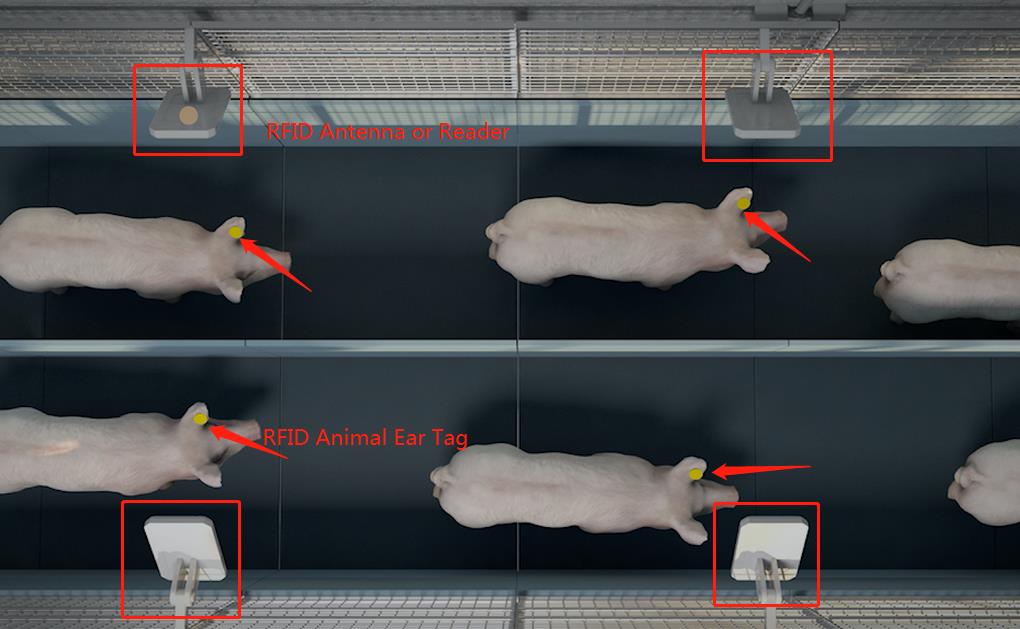 ترتدي الحيوانات علامات أذن إلكترونية بتقنية RFID، ويتم تثبيت قارئ تعريف علامات الأذن الإلكترونية بتقنية RFID في باب الوصول أو في حظيرة التكاثر. عندما تمر الحيوانات عبر بوابة المرور أو حظيرة التغذية، يمكن عدها تلقائيًا، ويمكن تحميل المعلومات التي تم جمعها إلى خلفية إدارة المحطة الطرفية في الوقت الفعلي لتجميع البيانات. تم تركيب حظيرة تغذية مزودة بتقنية RFID وباب تفتيش، والذي يمكنه تسجيل ما إذا كان الحيوان خارج الحظيرة وما إذا كان قد عاد إليها تلقائيًا، مما يقلل من احتمالية حدوث الأخطاء.