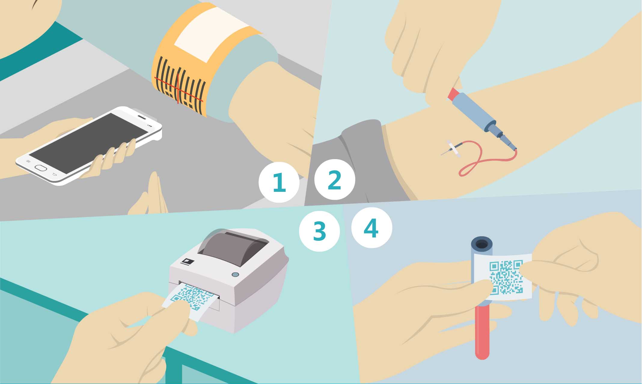 في عملية جمع العينات، عادةً ما يقوم طاقم التمريض بطباعة جميع ملصقات المرضى مسبقًا ولصقها على كل أنبوب اختبار فارغ؛ إذا تم تأكيد الهوية شفهيًا قبل الجمع، فقد تكون هناك حالات لا تتطابق فيها العينات المجمعة مع المريض الموجود على الملصق؛
