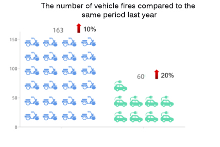 وبحسب بيانات من إدارة الحماية من الحرائق في مقاطعة قوانغدونغ، فقد وقع 163 حريقاً في الدراجات الكهربائية في الربع الأول من عام 2022 بعد مرور عام زيادة سنوية بنسبة 10% و60 حريقًا في المركبات الكهربائية أو الهجينة، بزيادة سنوية قدرها 20٪.