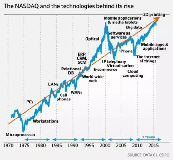 منذ سبعينيات القرن الماضي، كان النمو السريع لمؤشر ناسداك المركب الذي لا يمكن إيقافه مدفوعًا بأجهزة جديدة تتأثر بمطوري البرامج.