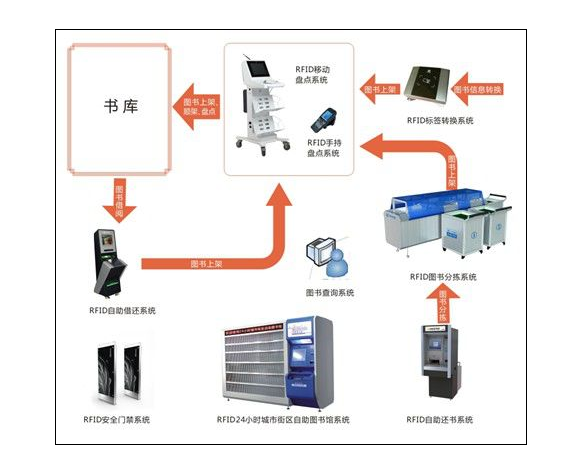 نظام إدارة الكتب بتقنية RFID يشمل نظام نقل العلامات، ونظام الاستعارة الذاتية، ونظام الإرجاع الذاتي، ونظام البحث الذكي، ونظام جرد السيارات اليدوية، ونظام فحص البوابات الآمنة.