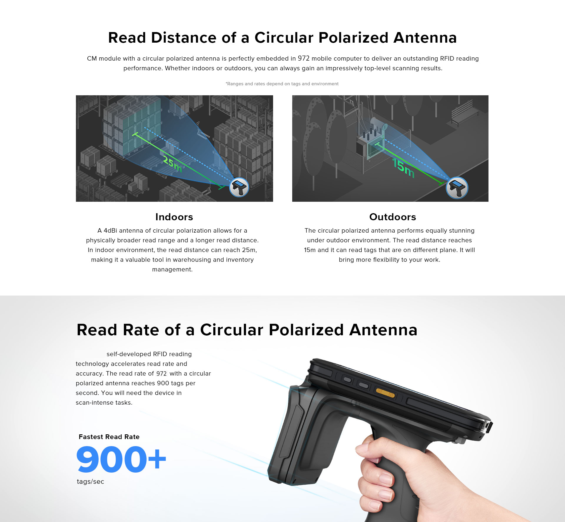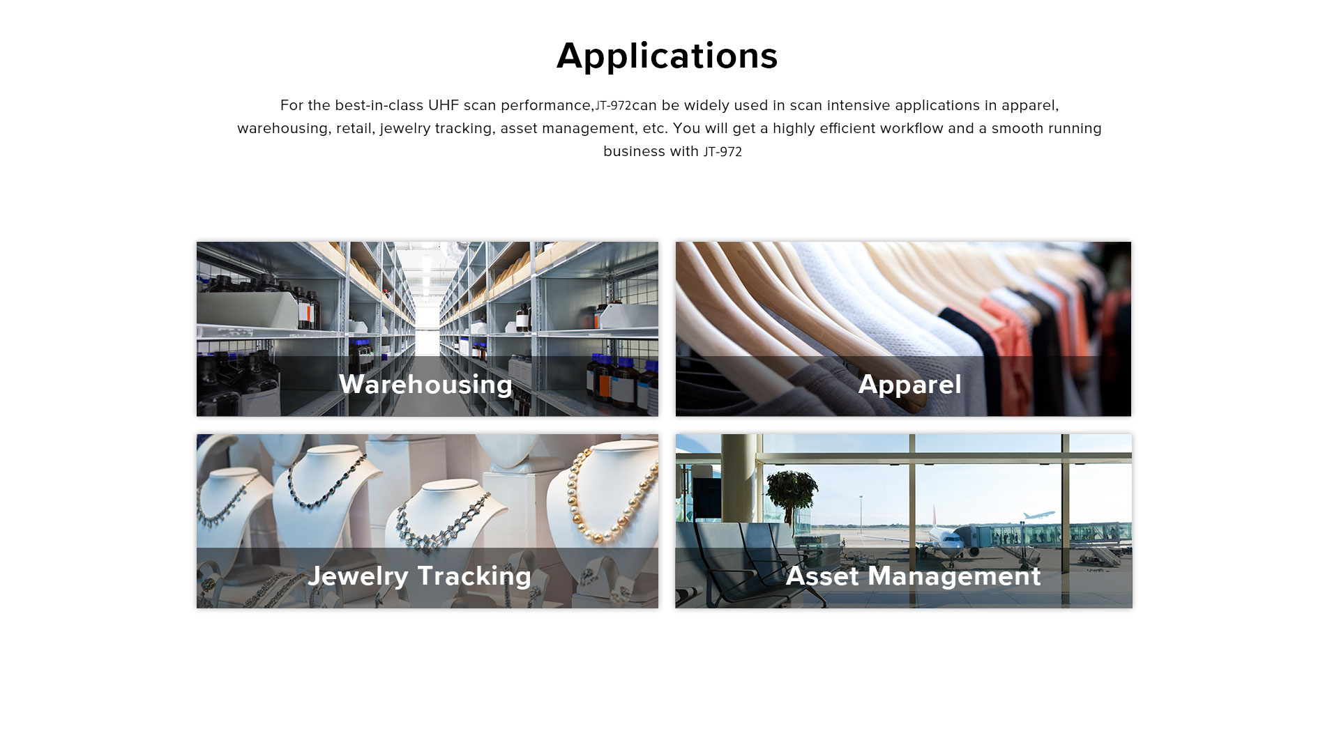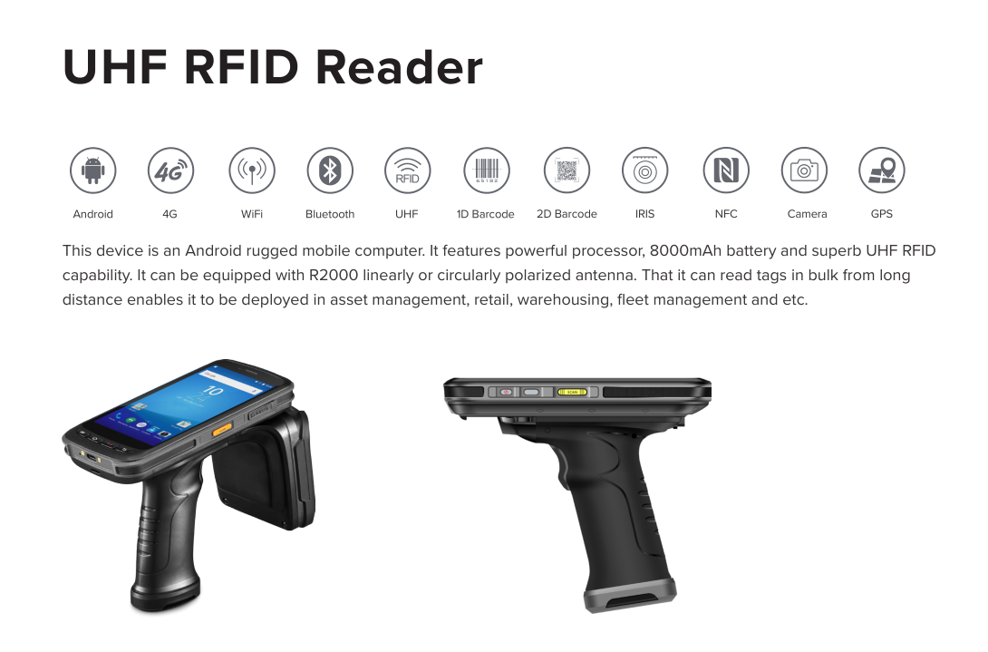 جهاز JT-972 عبارة عن كمبيوتر محمول متين يعمل بنظام أندرويد. يتميز بمعالج قوي وبطارية بسعة 8000 مللي أمبير في الساعة وتقنية UHF RFID فائقة. هذه الميزة تسمح بتزويدها بهوائي R2000 ذي استقطاب خطي أو دائري، كما أنها قادرة على قراءة البيانات بكميات كبيرة من مسافات بعيدة.